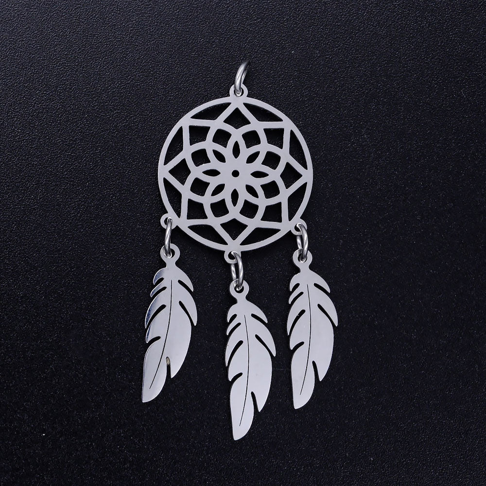 201 Stainless Steel Pendants, with Jump Rings, Woven Net/Web with Feather, Stainless Steel