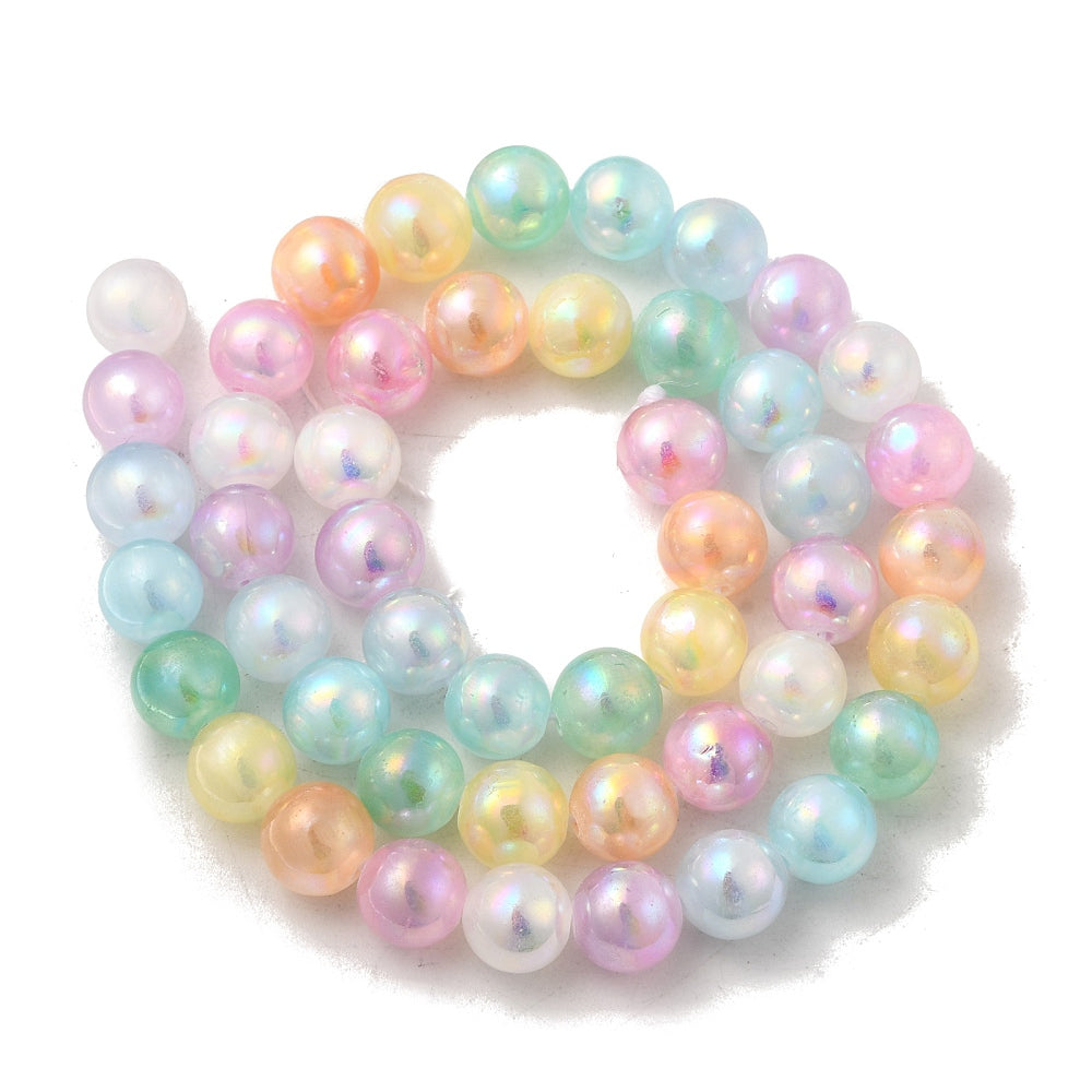 8mm AB plated natural selenite beads, ~50 per 15" strand. Iridescent rainbow finish perfect for bracelets, necklaces & spiritual jewelry projects.