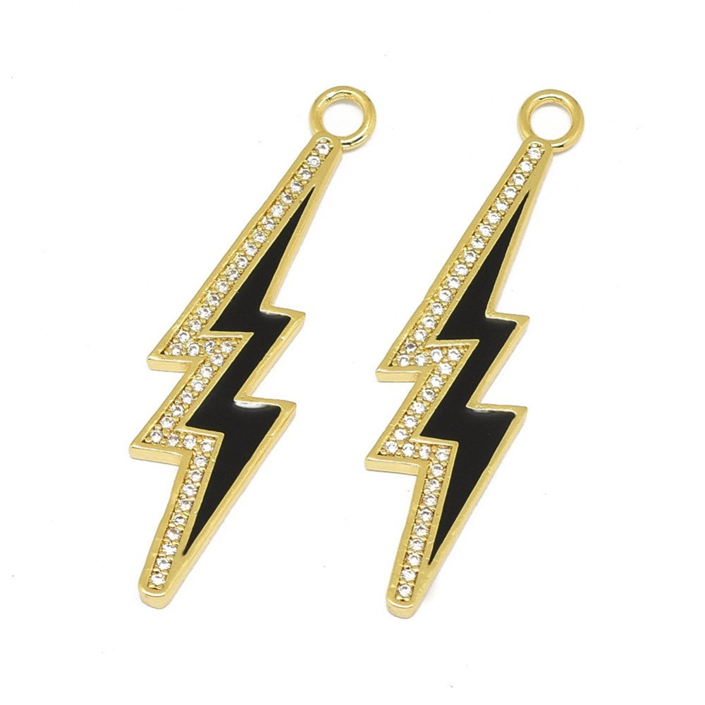 Alloy Micro Pave Cubic Zirconia Pendants, with Enamel, Long-Lasting Plated, Lightning Bolt, Black, Golden 2 pack