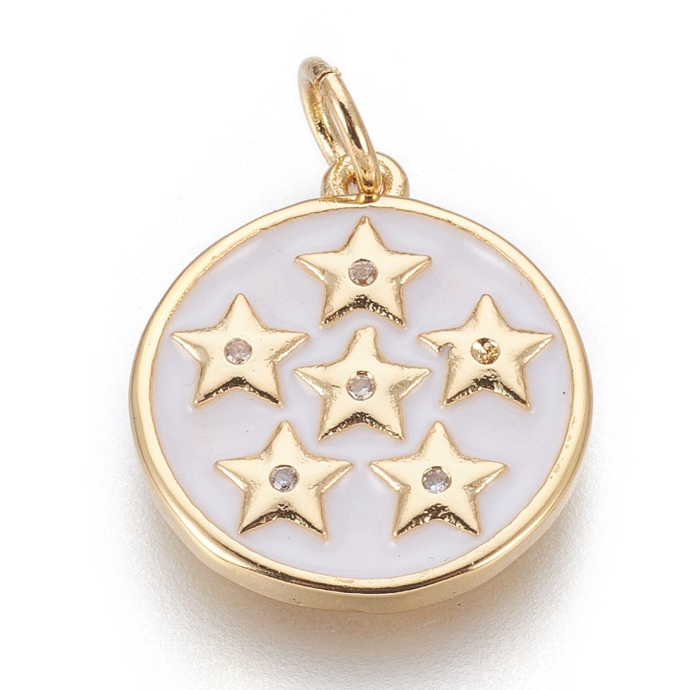 Brass Enamel Pendants, with Cubic Zirconia, Flat Round with Star, White, Golden