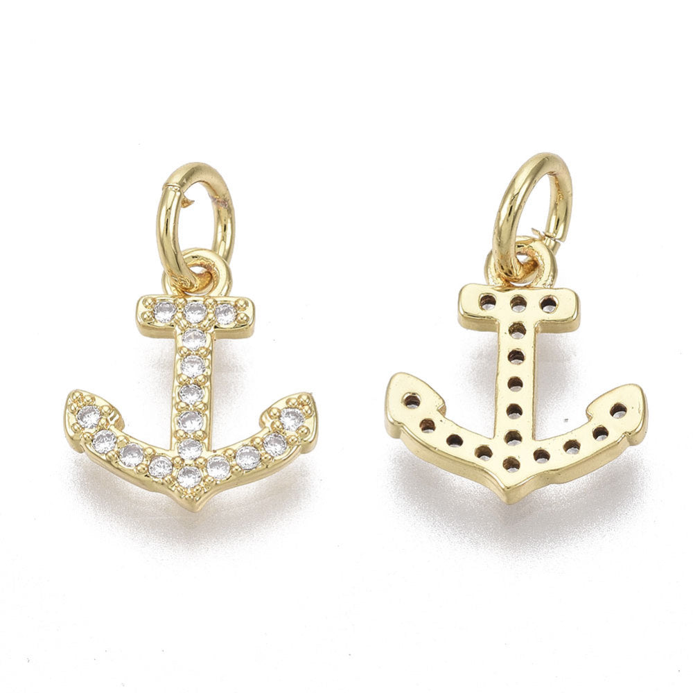 Brass Micro Pave Cubic Zirconia Anchor Charm, with Jump Ring, Real 18K Gold Plated