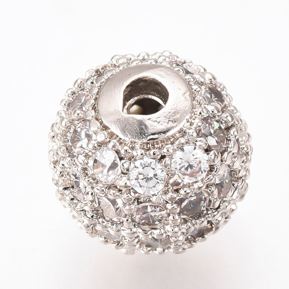Brass Micro Pave Cubic Zirconia Beads, Round, Clear, Platinum 2 Pk