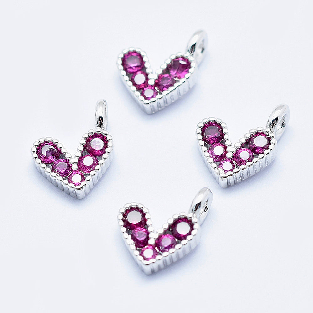 Brass Micro Pave Cubic Zirconia Charms, Long-Lasting Plated, Lead Free & Nickel Free & Cadmium Free, Heart, Hot Pink, Real Platinum Plated