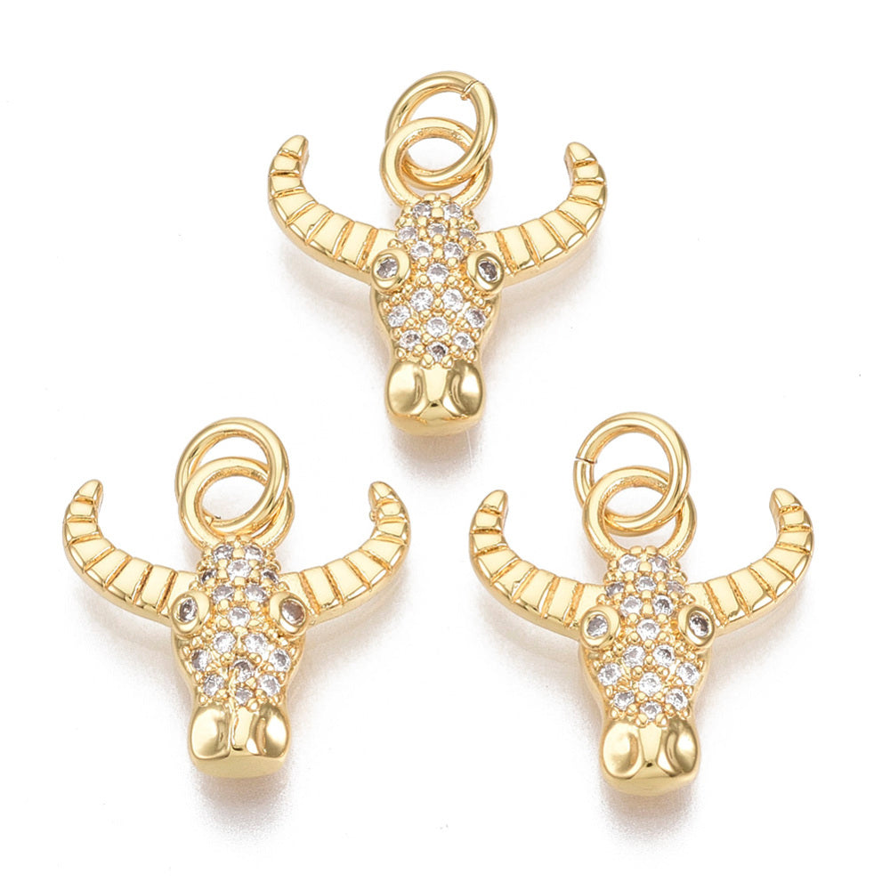 Brass Micro Pave Cubic Zirconia Charms Ox Head, with Jump Rings, Nickel Free, Clear, Real 16K Gold Plated
