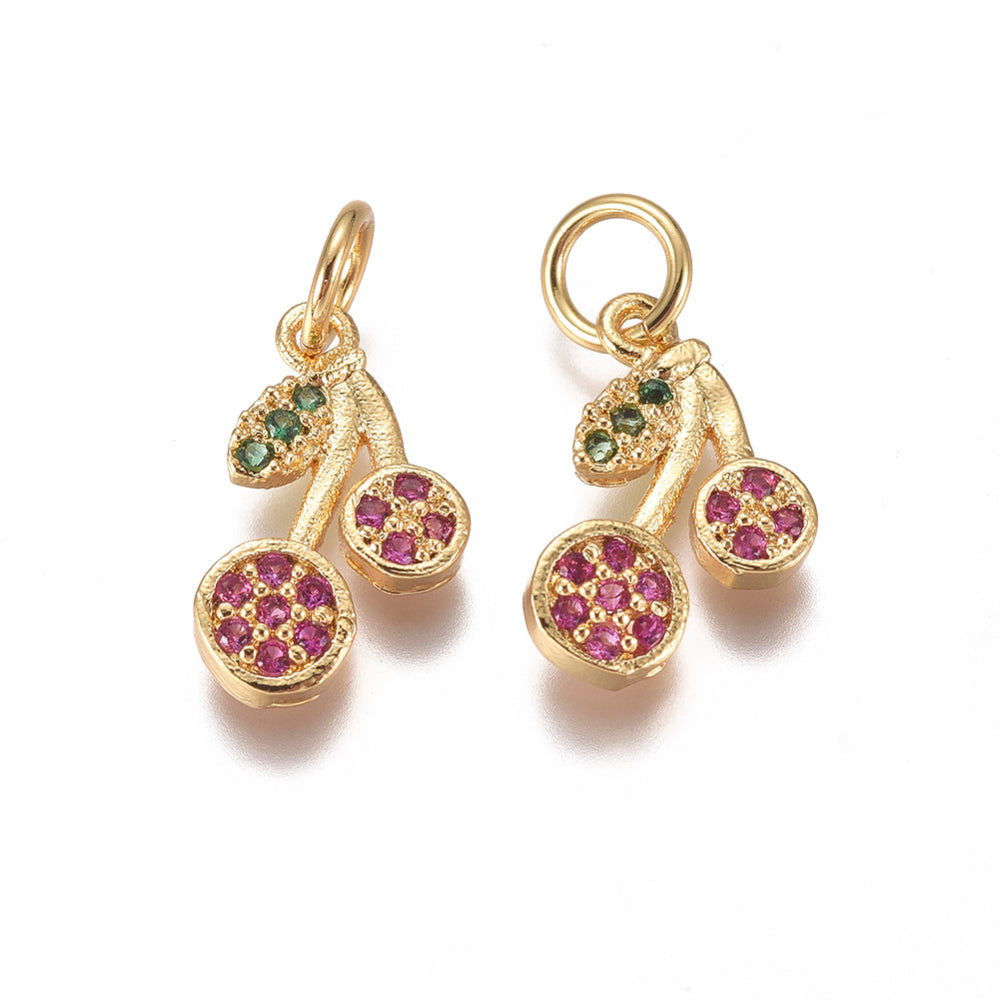 Brass Micro Pave Cubic Zirconia Charms, with Jump Rings, Cherry, Magenta & Green, Platinum; Golden