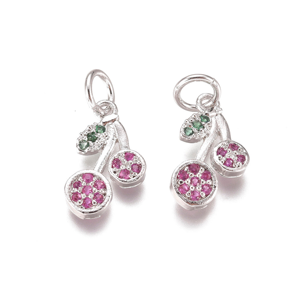 Brass Micro Pave Cubic Zirconia Charms, with Jump Rings, Cherry, Magenta & Green, Platinum & Golden