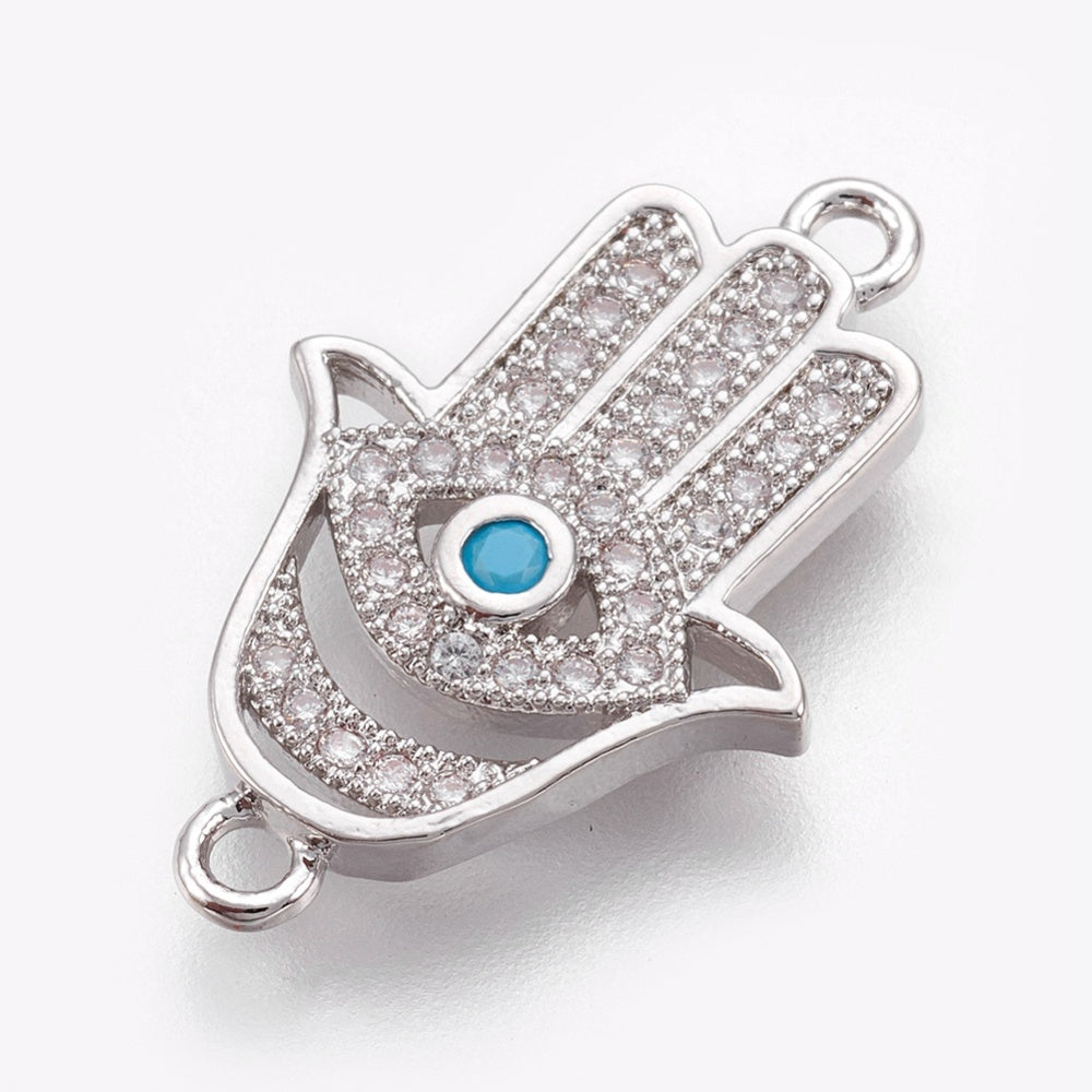 Brass Micro Pave Cubic Zirconia Links, Long-Lasting Plated, Hamsa Hand/Hand of Fatima/Hand of Miriam, Lead Free & Nickel Free & Cadmium Free, Clear, Real Platinum Plated