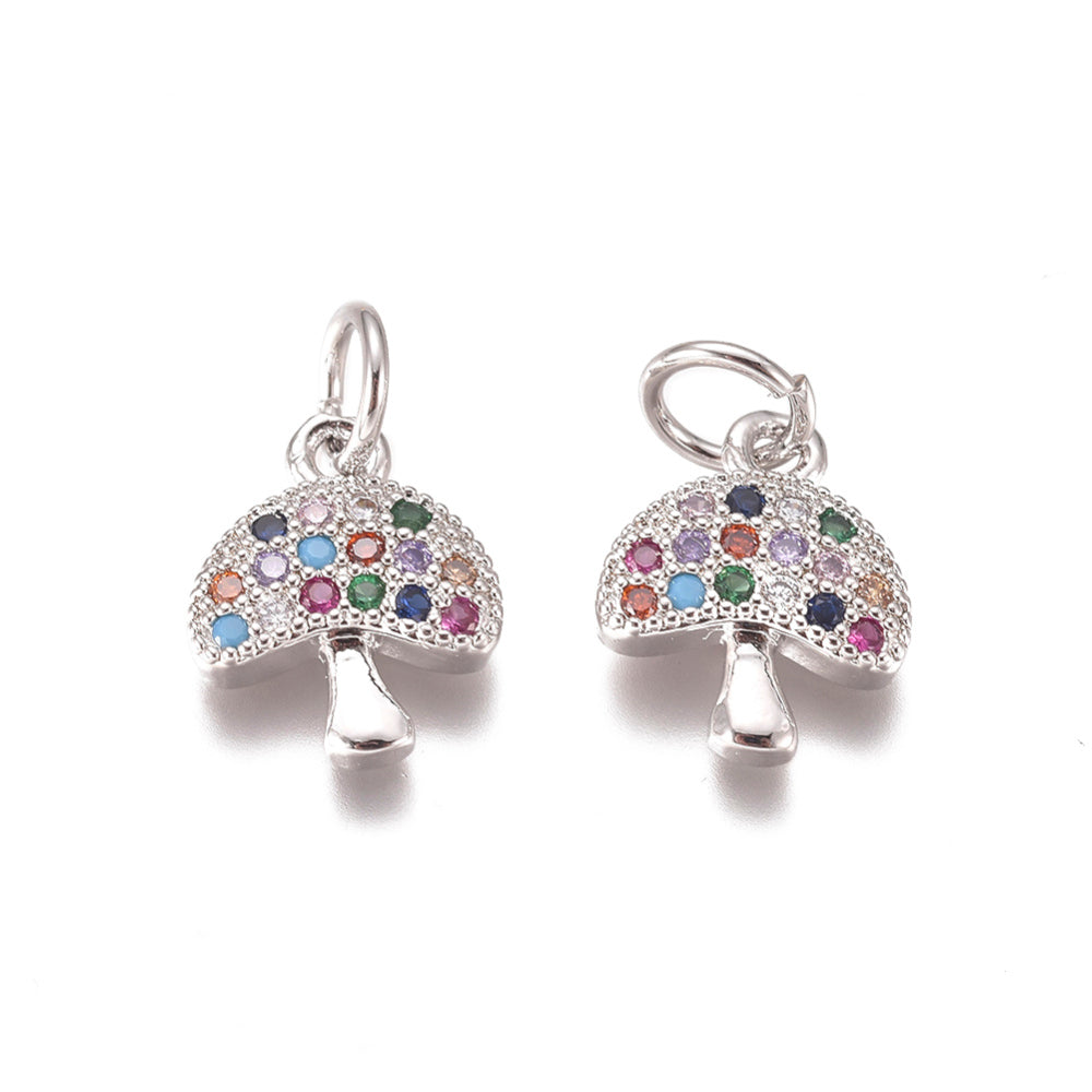 Brass Micro Pave Cubic Zirconia Mushroom Charms, with Jump Rings, Colorful, Platinum or Gold
