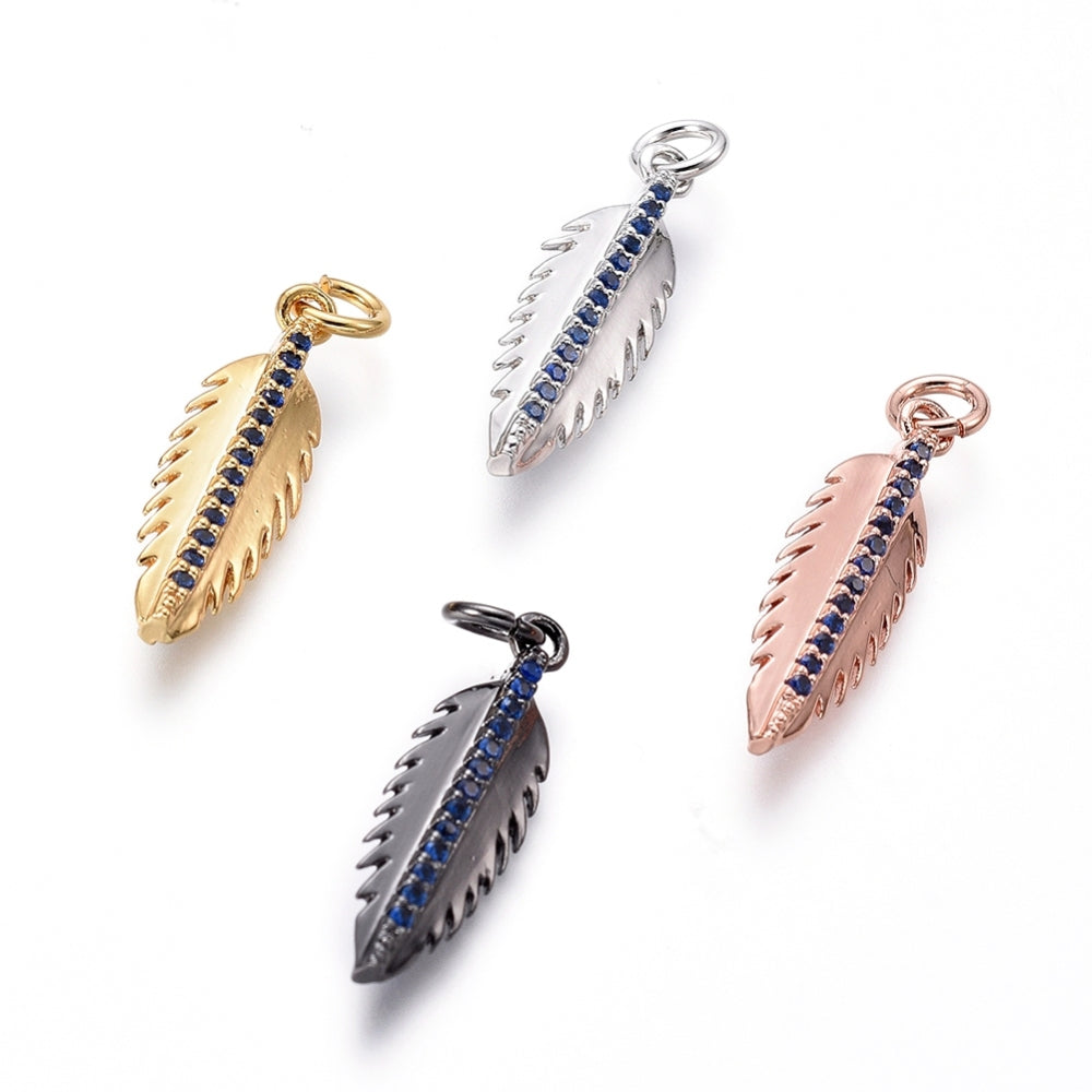 Brass Micro Pave Cubic Zirconia Pendants, with Jump Rings, Feather, Blue, Mixed Color