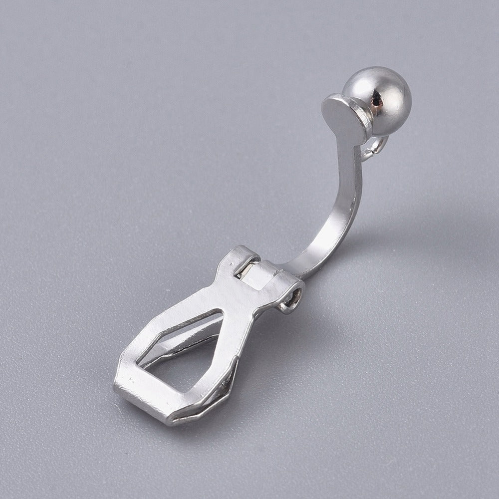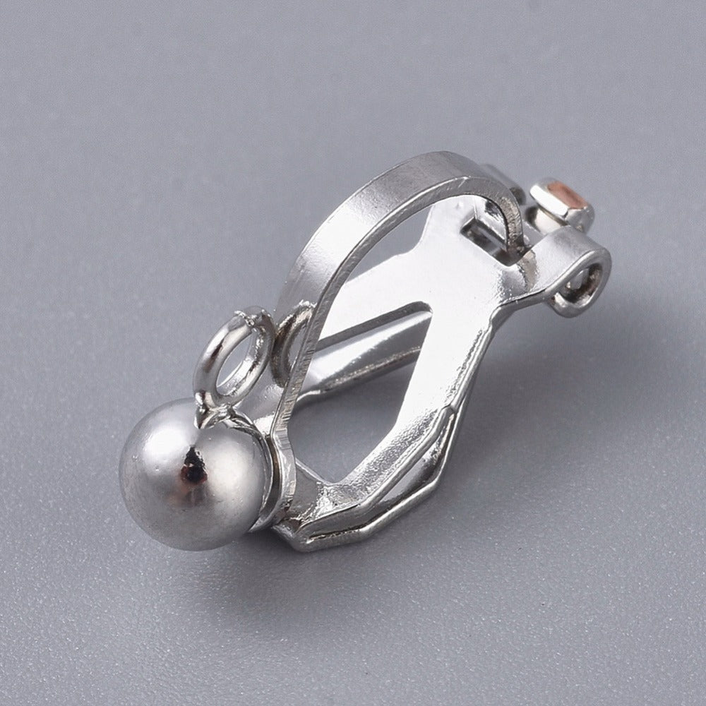 Shop brass clip-on earring findings with loop at The Pink Bead Shop. Available in 18K gold plated or platinum finishes, 16×6×8mm with 1.6mm loop — perfect for creating stylish earrings for non-pierced ears.