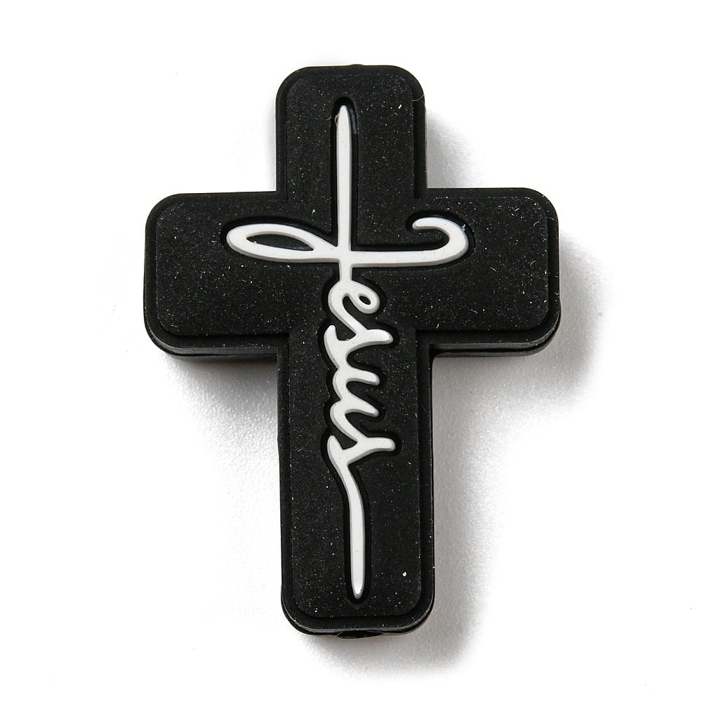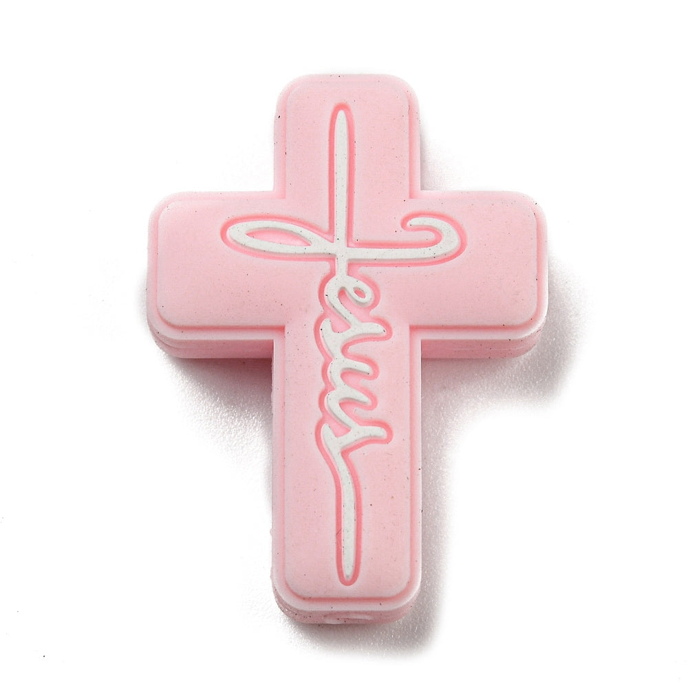 Cross with Word Jesus Silicone Focal Beads, Chewing Beads For Teethers, DIY Nursing Necklaces Making, Pink