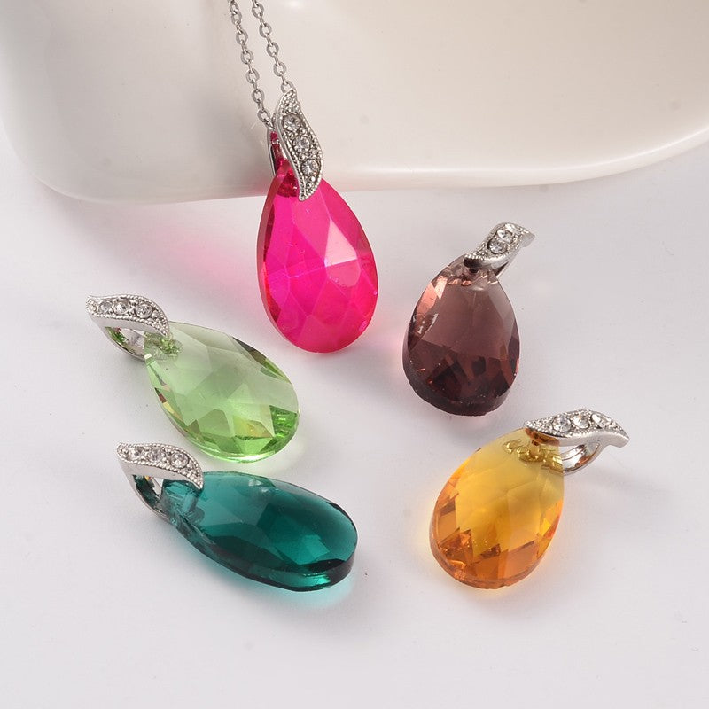 Faceted Teardrop Brass Glass Pendants, with Rhinestone, Platinum, Mixed Color