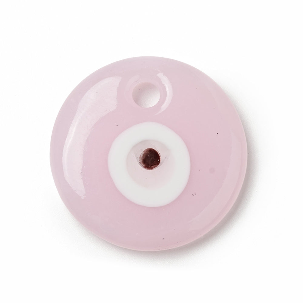 Handmade Evil Eye Lampwork Pendants, Flat Round , Pearl Pink