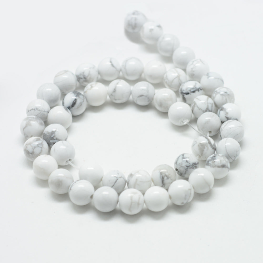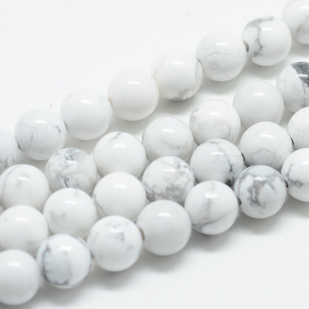 Shop natural white howlite beads in 6mm & 8mm round sizes at The Pink Bead Shop. Each strand features elegant white beads with gray veining and 1mm holes — perfect for stringing on wire, cord, or leather to create timeless, calming jewelry designs.