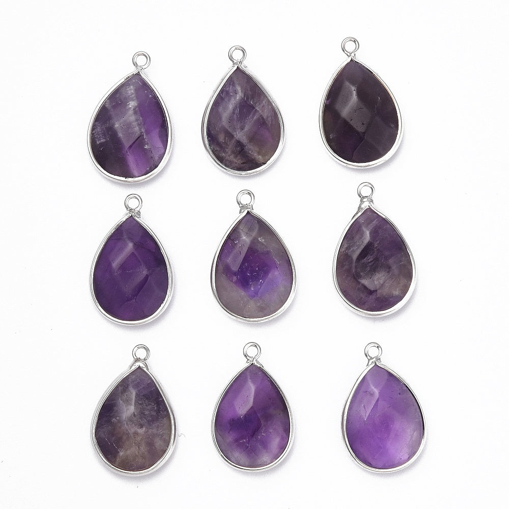 Natural Amethyst Pendants, with Platinum Plated Brass Edge & Loops, Teardrop, Faceted,