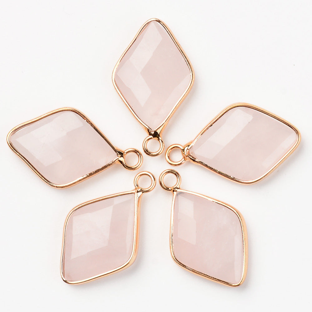 Natural Rose Quartz Pendants, with Light Golden Plated Brass Edge, Rhombus, Faceted, Size: about 26mm long, 15.5mm wide, 4.5mm thick, hole: 2mm. 2 Pack