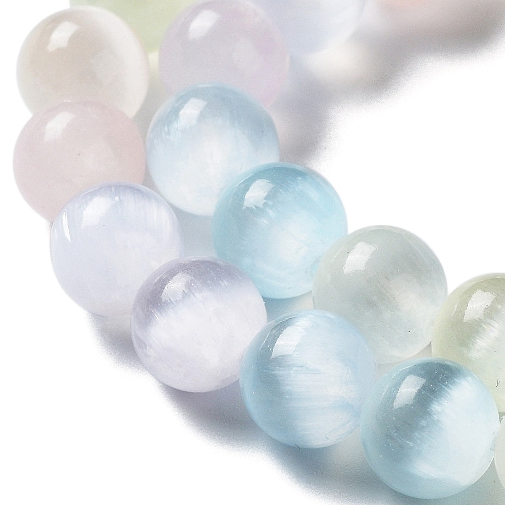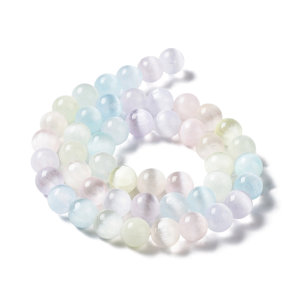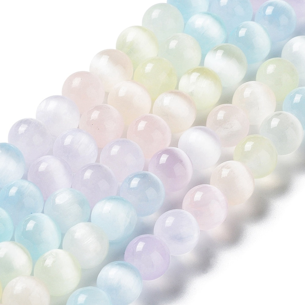 Natural Selenite – dyed macaron pastel colors Smooth Round Shape – approx. 8mm 1mm Hole Size – works with wire, stretch cord, or leather cord ~48 Beads Per Strand – strand length approx. 15.43” (39.2cm) Perfect for Fun, Whimsical Jewelry – bracelets, necklaces, earrings Metaphysical Properties – clears energy, promotes joy and harmony