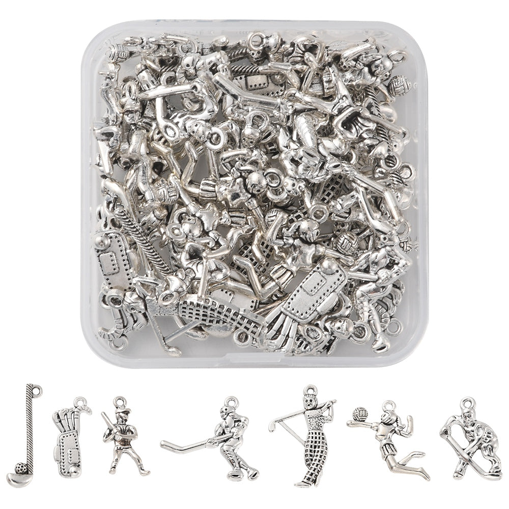 42Pcs 7 Style Sports Theme Tibetan Style Alloy Pendants, Baseball Player/Hockey Player/Volleyball Player/Golf, Antique Silver