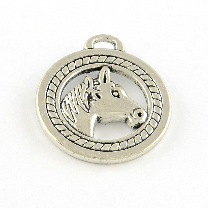 Tibetan Style Alloy Pendants, Flat Round with Horse Head, Cadmium Free & Lead Free, Antique Silver