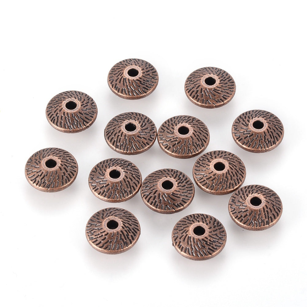 Tibetan Style Alloy Spacer Beads, Lead Free and Cadmium Free and Nickel Free, Flat Round, Red Copper Color 20 Pack