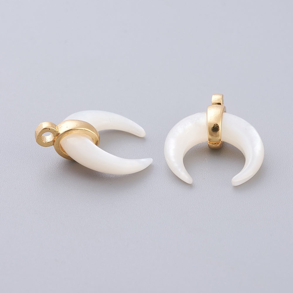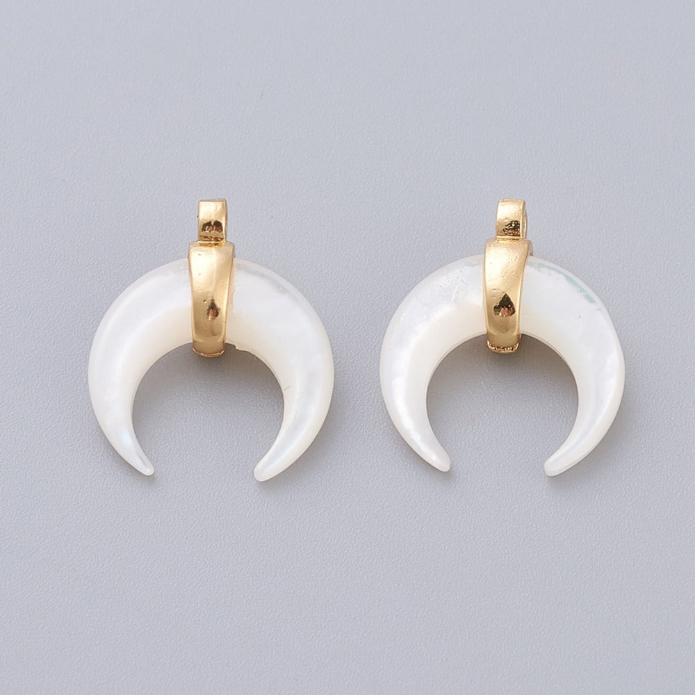 Natural White Shell Mother of Pearl Shell Pendants, with Golden Plated Brass Findings, Double Horn/Crescent Moon,